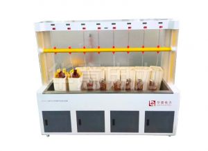 試驗水槽從放入試品后自動(dòng)動(dòng)定量注水、試品下降浸入外電極水槽、高壓電極下降連接試品、進(jìn)入試驗狀態(tài),試驗完成、試品平臺提升、高壓電極提升全過(guò)程全自動(dòng)進(jìn)行。一次可以進(jìn)行8只試品的測試。在測試過(guò)程中試驗臺采用大型LED數碼管顯示8路試品泄漏電流等參數。