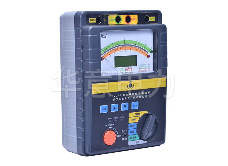 2、兩種方式同步顯示絕緣阻值。機械指針采用超薄型張絲結構抗震能力強。機械指針的采用可容易觀(guān)察絕緣電阻的變化范圍,點(diǎn)陣液晶屏的采用可指導用戶(hù)操作儀表并可精確得出測量結果;