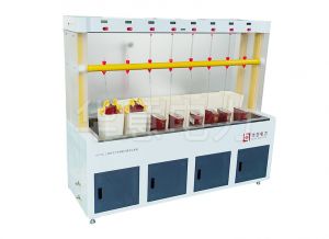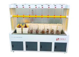 試驗水槽從放入試品后自動(dòng)動(dòng)定量注水、試品下降浸入外電極水槽、高壓電極下降連接試品、進(jìn)入試驗狀態(tài),試驗完成、試品平臺提升、高壓電極提升全過(guò)程全自動(dòng)進(jìn)行。一次可以進(jìn)行8只試品的測試。在測試過(guò)程中試驗臺采用大型LED數碼管顯示8路試品泄漏電流等參數。