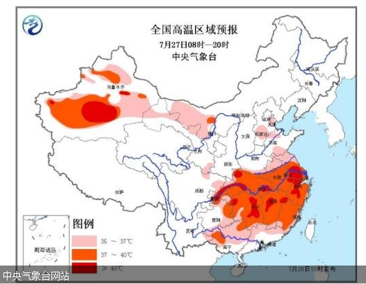 26日18時(shí),中央氣象臺繼續發(fā)布高溫橙色預警。預計27日白天,華南北部、江南、江淮、江漢、黃淮南部、華北南部、四川盆地東部、重慶、貴州北部和東部以及新疆、甘肅西北部、內蒙古西部等地有35~39℃的高溫天氣。