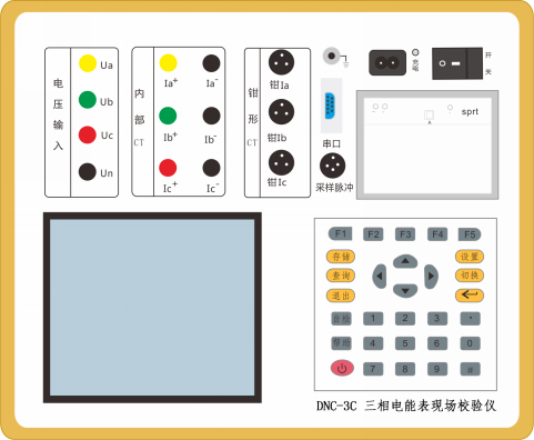 DNC-3C 三相電能表現場(chǎng)校驗儀面板下方的左側是液晶顯示器,右側是按鍵區;上方左側為接線(xiàn)端子部分,包括:電壓輸入端子UA、UB、UC、UN;電流輸入端子Ia+、Ia-、Ib+、Ib-、Ic+、Ic-(其中Ia+、Ib+、Ic+為電流流入端,Ia-、Ib-、Ic-為電流流出端 ;鉗形電流互感器接口(A相鉗、B相鉗、C相鉗);向右為接地端子、光電及脈沖信號接口和232串行口(用于上傳保存的數據至計算機);最右端為充電器接口(用于連接充電電源)和儀器工作開(kāi)關(guān);下方為打印機。