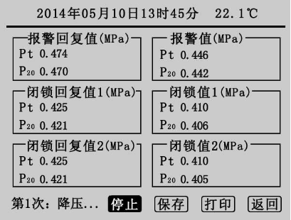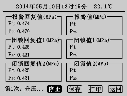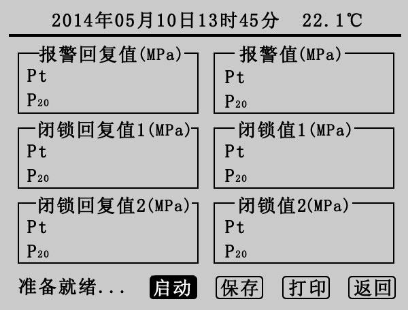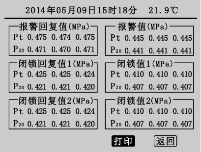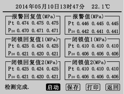 在圖3.3所示界面中,有報警回復值、報警值、閉鎖回復值1、閉鎖值1、閉鎖回復值2、閉鎖值2三組值,根據設置的檢測次數和信號類(lèi)型,測試結果都會(huì )相應的顯示,Pt為當前環(huán)境溫度下的壓力值,P20為換算成20℃時(shí)的等效壓力值。