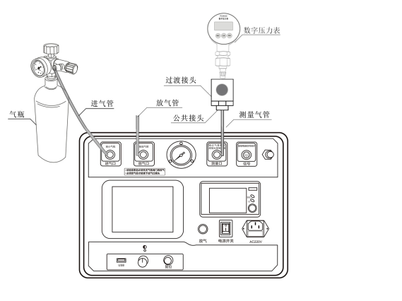 常溫壓力表校驗接線(xiàn)如圖3.7所示,進(jìn)氣管連接儀器進(jìn)氣口與氣瓶,放氣管連接放氣口,測量氣管通過(guò)過(guò)渡接頭和公共接頭將儀器面板上的測量口和待校驗的壓力表連接。