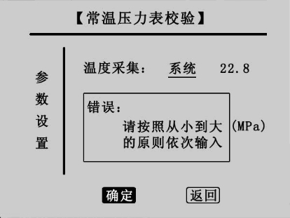 壓力目標值:此值為預設的壓力測試點(diǎn),最多可設置四組,設置時(shí)應當從小到大依次設置,若設置有誤,點(diǎn)擊“確定”會(huì )有如圖3.9所示的錯誤信息提示。正確設置壓力目標值后,點(diǎn)擊“確定”進(jìn)入常溫壓力表校驗界面,點(diǎn)擊“返回”則返回主界面。