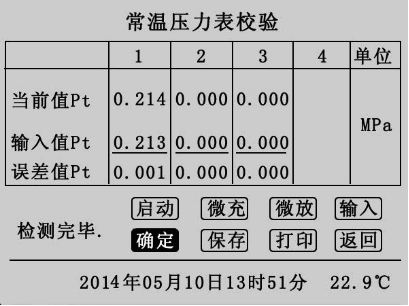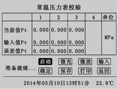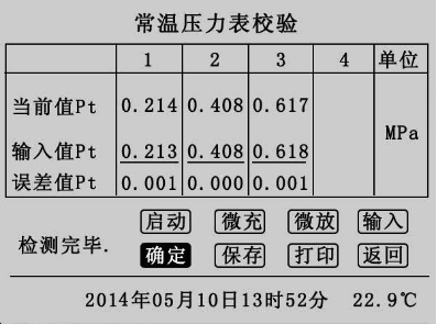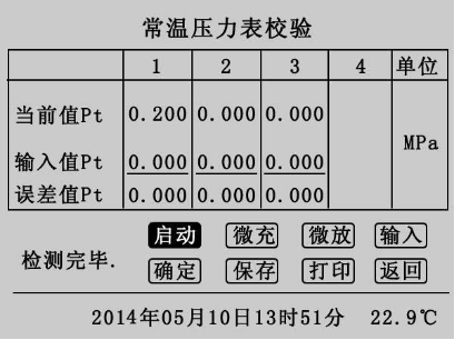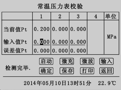 在參數設置界面預設幾組測試點(diǎn)則在該界面的1、2、3、4欄中就會(huì )相應的出現幾組默認0.000的數值?!皢?dòng)”項為自動(dòng)充氣升壓到預設點(diǎn),“微充”、“微放”項為手動(dòng)充放氣,“輸入”項為手動(dòng)輸入待測壓力表的顯示值,“確定”項為一組測試點(diǎn)檢測完成,計算并顯示出誤差值,測試完成后可保存或打印校驗結果。