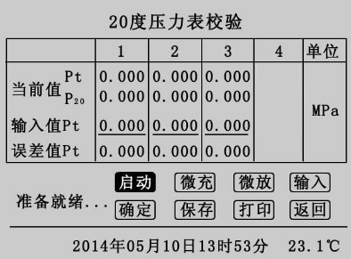 在主界面上光標選中“20度壓力表校驗”項,“按下選定”則進(jìn)入20度壓力表校驗界面。20度壓力表校驗操作流程與常溫壓力表校驗完全一樣,只是在界面上有所區別,唯一區別是在當前值項上同時(shí)顯示20℃時(shí)的等效壓力值,如圖3.16所示。