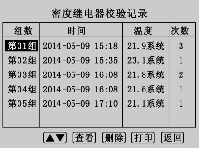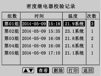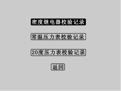 在主界面上光標選中“歷史數據瀏覽”項,“按下選定”進(jìn)入歷史數據瀏覽界面,如圖3.17所示。在該界面旋轉鼠標選擇“密度繼電器校驗記錄”,點(diǎn)擊進(jìn)入圖3.18界面: