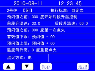 ◆用手指觸摸(或用觸摸筆觸摸)爐號下面的“執行標準”、“預閃值”對應的參數,選中后用“▲”、“▼”鍵,調整選中的數字或文字;當選擇“執行標準”參數后,按“▲”、“▼”鍵選擇執行標準,當執行標準為“自定義”時(shí),這時(shí)按兩次“自定義”進(jìn)入自定義參數設置畫(huà)面,如圖6-5
