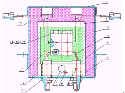 其結構及工作原理是:在一個(gè)導熱體中加工四個(gè)對稱(chēng)的腔室,每個(gè)腔室中各放一個(gè)熱敏元件。其中,兩個(gè)腔室是測量池,另外兩個(gè)是參比池。測量池和參比池內的熱敏元件組成了惠斯登電橋的四個(gè)臂。該電橋接入熱導池檢測器信號處理板以控制電橋的工作及信號的輸出。在熱導池檢測器內還裝有加熱器件和感溫元件,與溫度控制系統相接以控制其所需溫度。