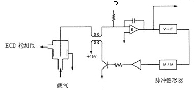 ECD檢測池中封入的放射源(63Ni)產(chǎn)生β放射線(xiàn),使惰性氣體(N2)離子化,在檢測池的電極上加上脈沖電壓,捕獲電子產(chǎn)生電流。吸收電子能力強的強電負性分子進(jìn)入池中吸收自由電子,形成負離子。由于帶負電荷的分子比自由電子的移動(dòng)速度慢,到達正電極的時(shí)間長(cháng),而且與正離子再結合的概率也增大,使檢測器中的電子密度減小,根據電子數減少的程度相應加上多次脈沖,以保持每個(gè)單位時(shí)間內電子數形成的電流恒定,則脈沖數的變化與強電負性分子的濃度成正比。ECD裝置示意圖如下: