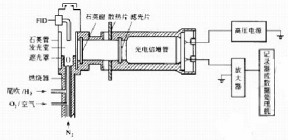 右側為光電轉換部分。為了避免火焰中產(chǎn)生的大量水蒸氣、燃燒產(chǎn)物和高溫對光電轉換系統的影響,用石英窗和散熱片將光室和光電系統隔開(kāi)。FPD不是將所有的光變成電信號,而是用濾光片選擇硫、磷的特征光。