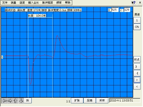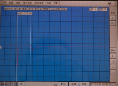 根據顯示波形大小,調節幅度電位器,重新采樣。當 0.1μs 脈寬輸入振幅最大還無(wú)反射波時(shí),選用0.5μs或其他兩個(gè)寬度脈沖測試。為了便于比較可分別接故障相、電纜好相做兩次采樣。完成采樣后,移動(dòng)光標定起點(diǎn),再移動(dòng)光標到波形反射點(diǎn),此時(shí)屏幕所顯示的長(cháng)度就是電纜全長(cháng)值。對于短電纜最好將終端短路測全長(cháng),終端反射為反向脈沖。