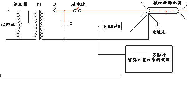 圖中:調壓器為1—5KVA,PT為高壓變壓器,功率 1— 5KVA,D 為高壓整流硅堆,大于 50KW/ 0.2 A(高壓試驗變壓器已內置),C 為高壓電容,容量1—8μF,耐壓大于 10KV~40KV。