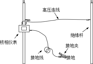 6.特別注意的是在操作時(shí),人體不得接觸核相儀表、高壓連線(xiàn),人體與核相儀表要保持2.1米的安全距離(將核相儀表放在第二根連接桿上端),接地線(xiàn)要可靠接地。同時(shí)人體與高壓連線(xiàn)也要保持足夠的安全距離(2.1米)(請嚴格按照核相器試驗操作規程的要求進(jìn)行操作核相)。連接兩根測試竿的測試線(xiàn)為普通220V導線(xiàn),在核相時(shí)人體不得接觸或近距離接觸該導線(xiàn)。使用時(shí)應將過(guò)長(cháng)的導線(xiàn)用扎帶扎在第一根測試竿上,同時(shí)離人體要有足夠的安全距離(請參照高壓電器操作規程),高壓連線(xiàn)也不得與大地接觸。