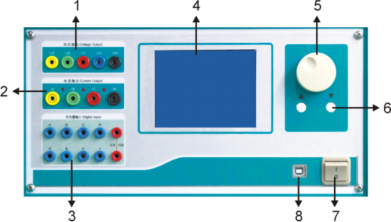 繼電保護測試儀裝置在機箱底板上裝設有一路可調直流電源輸出,分 110V 及 220V 兩檔,可作為現場(chǎng)試驗輔助電源。該電源輸出電流最大可達1.5A。底板上另裝設有一個(gè)散熱風(fēng)扇、電源插座、接地端子和三個(gè)保險。三個(gè)保險中一個(gè)是輔助直流電源保險(2A/250V),兩個(gè)是電壓回路保險(2A/250V)等。