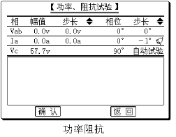 試驗中裝置可任意指定某一路相電壓或線(xiàn)電壓、某一相電流或相間電流,該電壓、電流值均可任意變化,其相角也可任意調整,用于做功率方向或阻抗繼電器的動(dòng)作返回角、動(dòng)作功率、動(dòng)作阻抗等試驗。該試驗中未參與調整的相其電壓固定為為57.7V。