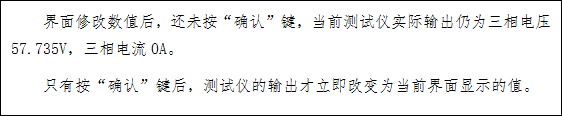(3)在手動(dòng)方式時(shí),可以同時(shí)將各相輸出改變?yōu)樗枰闹?。具體操作方法是:依次直接鍵入所需改變的各相的幅值和相位值(在未完成前不按“確認”鍵),在各值均輸入完后按“確認”鍵,裝置將立即同步地將各相輸出改變?yōu)殒I入的各值。