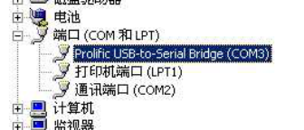 6. 從右圖中可以看出,該端口被默認為COM3,應將其改為COM1。在Prolific USB-to-serial Bridge(COM3)上雙擊鼠標,或右鍵點(diǎn)擊,從菜單中選擇“屬性”;