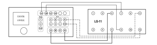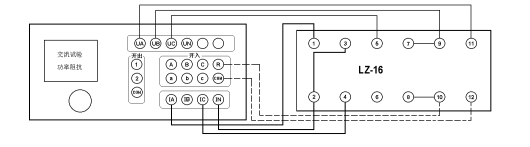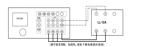 在交流試驗中,Ua(或Uab)/Ia設定為某一初值,設置步長(cháng),按“▲”、“▼”鍵或旋動(dòng)旋鈕(亦可用自動(dòng)試驗方式)加減電壓/電流,測量電壓/電流/反時(shí)限電流繼電器的動(dòng)作值和返回值及動(dòng)作時(shí)間和返回時(shí)間,計算返回系數。下圖為L(cháng)L-12A過(guò)電流繼電器的接線(xiàn)圖。