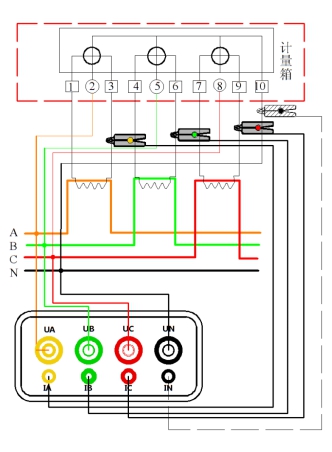 電壓線(xiàn)的連接:使用專(zhuān)用電壓測試線(xiàn)(黃、紅、黑三組),一端依次插入本儀器的UA、UC、UN相插孔,另一端分別接入被測線(xiàn)路的A相、C相、B相。注意:黃色線(xiàn)接UA插孔,黑色線(xiàn)接UN插孔、紅色線(xiàn)接UC插孔。