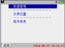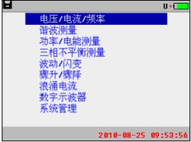 儀表主菜單如上圖,屏幕上方紅色顯示的為儀表當前日期和時(shí)間,右上角顯示的為儀表電池電量,字母”U”表示儀表當前有正確插接U盤(pán),左上角的圖標