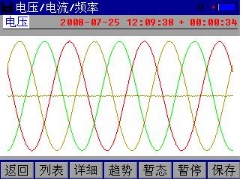 ????點(diǎn)擊趨勢鍵,以趨勢圖方式顯示結果,如圖 1-3。在左上角的列表框中,點(diǎn)擊上/下箭頭鍵,可切換顯示電壓趨勢圖、電流趨勢圖或頻率趨勢圖。在電壓趨勢圖中,由上到下依次為A相電壓、B相電壓和C相電壓。在電流趨勢圖中,由上到下依次為A相電流、B相電流、C相電流和零線(xiàn)電流,在頻率趨勢圖,顯示的是A相頻率。趨勢圖曲線(xiàn)從左側逐步形成,趨勢圖基準線(xiàn)上的讀數與曲線(xiàn)所繪制的最新數值相對應。趨勢圖低部為時(shí)間軸。