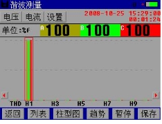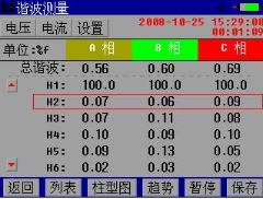 諧波測量功能可測量三相四線(xiàn)電系統的各相電壓、電流的1~50次諧波失真百分比。
