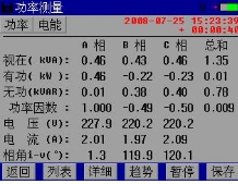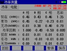 ????點(diǎn)擊列表鍵,以列表方式顯示功率測量結果或電能測量結果,如圖3-1和圖3-2。點(diǎn)擊功率或電能鍵切換顯示功率測量結果或電能測量結果。第一列為A相,第二列為B相,第三列為C相,第四列為該行值總和。在功率測量結果中,從上到下依次為三相視在功率、三 相有功功率、三相無(wú)功功率、三相功率因數、三相電壓有效值、三相電流有效值和三相功率因數角。在電能測量結果中,從上到下依次為三相視在功率、三相有功功率、三相無(wú)功功率、三相平均功率因數、三相有功電能、三相視在電能和三相無(wú)功電能。