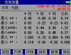 ????點(diǎn)擊詳細鍵,可顯示測量過(guò)程中各相有功功率、無(wú)功功率、功率因數的最大、平均、最小值。如下頁(yè)圖 3-4。