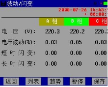 ????波動(dòng)測量開(kāi)始后,會(huì )以趨勢圖方式顯示當前測量電壓,如圖6-3。趨勢圖由上到下依次為A相電壓波動(dòng)值、B相電壓波動(dòng)值和C相電壓波動(dòng)值。趨勢圖曲線(xiàn)從左側逐步形成,圖中三色框中顯示的數字分別與曲線(xiàn)所繪制的最新數值相對應。