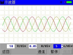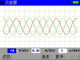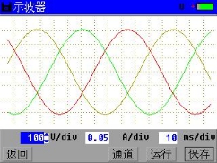 ????點(diǎn)擊相應通道鍵進(jìn)行信號幅值(檔位)設置,如圖9-4示,光標所在處反相顯示的數字為藍色(A相電壓)信號的幅值(10V/格)。此時(shí)可由上/下箭頭鍵改變其幅值。切換到哪個(gè)通道,其控件將以藍色顯示