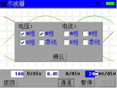 ????在數字示波器運行時(shí),點(diǎn)擊通道鍵彈出示波器運行采樣通道選擇窗口。點(diǎn)擊相應的選擇框,通道前出現√為選擇開(kāi)通。選擇好通道后,點(diǎn)擊確認鍵完成設置;如圖9-2中表示對電壓—A相通道進(jìn)行采樣顯示。數字示波器最多可同時(shí)對任意3個(gè)通道(信號)進(jìn)行采樣顯示。