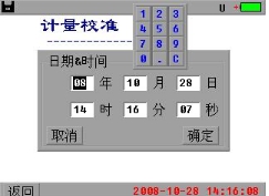 用于設置儀表日期和時(shí)間。如圖9-11??煞謩e輸入年、月、日、時(shí)、分和秒,點(diǎn)擊相應編輯框選擇輸入位置,由軟鍵盤(pán)數字鍵輸入數字。最后點(diǎn)擊確認鍵完成日期和時(shí)間設置。點(diǎn)擊左上角的取消鍵,可放棄本次設置,不改變儀表原來(lái)時(shí)鐘參數。