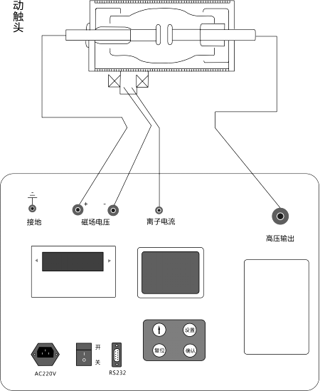 具體的操作為:先將儀器接地端接到大地上,再將磁控線(xiàn)圈通過(guò)磁場(chǎng)電流線(xiàn)連接儀器的磁場(chǎng)電壓正、負端,將高壓輸出端用高壓電纜連接到真空管的靜觸頭上,將離子電流輸入端通過(guò)離子電流線(xiàn)(屏蔽線(xiàn))接至真空管的動(dòng)觸頭上。