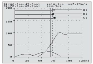 ????對所測得的“時(shí)間-行程”曲線(xiàn)進(jìn)行分析可以得到相關(guān)的數據,當然最主要的是得到剛分剛合速度數據。(如下圖)