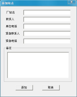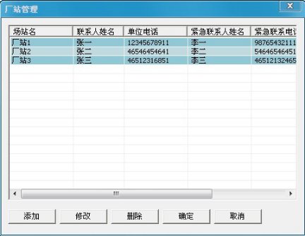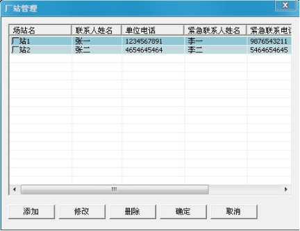 點(diǎn)擊工具欄上的廠(chǎng)站管理圖標(或點(diǎn)擊“操作”項下級菜單“廠(chǎng)站管理”)會(huì )彈出廠(chǎng)站管理的對話(huà)框如圖6所示,對話(huà)框內會(huì )以表格的形式顯示各廠(chǎng)站的信息,對話(huà)框的下方有“添加”、“修改”、“刪除”、“確定”、“取消”等操作按鈕。