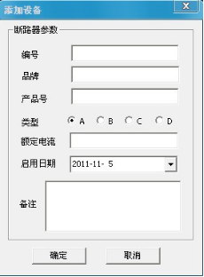 ????然后點(diǎn)擊“添加”按鈕,在彈出的圖12的對話(huà)框中填寫(xiě)設備信息?!熬幪枴?、“啟用日期”、“備注”等用戶(hù)可隨意輸入,“品牌”、“產(chǎn)品號”、“類(lèi)型”等參數用戶(hù)則需要參照被測斷路器上的廠(chǎng)家給出的標注進(jìn)行填寫(xiě)(如圖13所示)。參數設置完成后點(diǎn)擊“確定”完成設備型號的添加,如圖14所示。