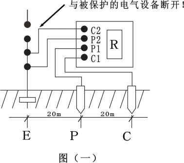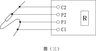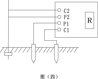 2.測量保護接地電阻時(shí),一定要斷開(kāi)電氣設備與電源連接點(diǎn)。在測量小于1Ω的接地電阻時(shí),應分別用專(zhuān)用導線(xiàn)連在接地體上,C2在外側P2在內側如圖四所示: