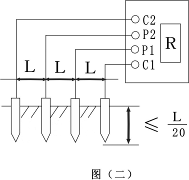 ①測量時(shí)在被測的土壤中沿直線(xiàn)插入四根探針,并使各探針間距相等,各間距的距離為L(cháng),要求探針入地深度為L(cháng)/20cm,用導線(xiàn)分別從C1、P1、P2、C2各端子與四根探針相連接。若地阻儀測出電阻值為R,則土壤電阻率按下式計算: