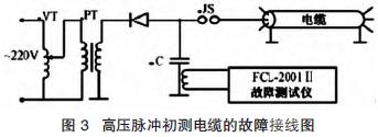 ? 目前高壓的脈沖法能夠對各種類(lèi)型的故障實(shí)行測試,特別是測試泄漏高阻情況比較有效。但是電纜所加沖擊電壓的大小時(shí),選擇的故障點(diǎn)需要可以充分進(jìn)行閃絡(luò )并放電,以及儀器可以自動(dòng)記錄沖閃波形最好,堅決不可以在開(kāi)始就把球隙調到很大。一旦故障點(diǎn)的放電比較困難,需要盡可能加大沖擊電壓或者是提高貯能電容的容量, 不可以加壓與沖閃。其中圖3 與圖4 就是高壓的脈沖法初步測試電流故障的接線(xiàn)圖和波形圖。