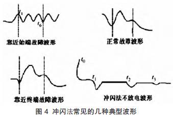 ? 目前低壓的脈沖法主要是按照微波的傳輸理念, 在電力電纜故障的相上加上脈沖的信號, 一旦電波傳送到故障的位置就會(huì )反射會(huì )部分電波, 然后仔細分析反射波和入射波之間時(shí)間的差值,精確計算故障點(diǎn)距離。因為輸出信號電力比較低且安全,所以經(jīng)常將這種測試方式叫做低壓的脈沖法,這種方式能夠用來(lái)測試電纜長(cháng)度、低阻故障與開(kāi)路故障等,具體波形的規律從圖5 中可以看出。
