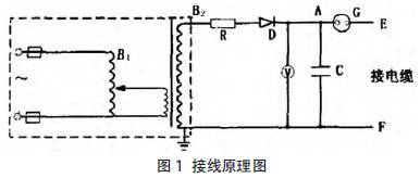? 在圖1 虛線(xiàn)框內的有控制箱、變壓器等設備, 調壓器B1能夠對電源電壓進(jìn)行調壓、調壓變壓器B2能夠進(jìn)行升壓。硅堆D 整流后就可以給電容器C 充電。當A 點(diǎn)電位上升到充電電壓最高值后, 就會(huì )經(jīng)過(guò)放電間隙使電纜故障點(diǎn)對地進(jìn)行放電。由于電纜故障點(diǎn)絕緣最弱,經(jīng)過(guò)多次放電后,故障點(diǎn)會(huì )發(fā)出聲音或者發(fā)熱,直到完全擊穿這種現象才會(huì )消失。這樣,就能準確的查找出電力電纜的故障點(diǎn)。接線(xiàn)的時(shí)候電力電纜絕緣較弱的一相接E, 剩下的二相接地,只有確定接線(xiàn)正確之后才能對故障點(diǎn)進(jìn)行查找。