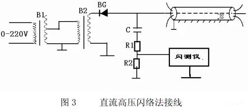? 直流高壓閃絡(luò )法適用于閃絡(luò )性故障,即故障點(diǎn)沒(méi)有形成電阻信道(或電阻值極高),但電壓升高到一定值時(shí)(通常是幾萬(wàn)伏)就會(huì )產(chǎn)生閃絡(luò )現象。 直流高壓閃絡(luò ) 法的接線(xiàn)圖如圖 3 所示。