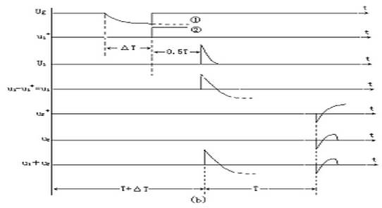 ? U1的起點(diǎn)較u2開(kāi)始閃絡(luò )的時(shí)間滯后了電波從故障點(diǎn)到測量端傳播所需的時(shí)間T/2。?U1在測量端還會(huì )被反射。反射波電壓u1-等于u1和u1+之差。U1-到達故障點(diǎn)后又會(huì )被故障點(diǎn)的短路電弧反射,然后又傳到測量端,成為第二入射波,以u2+表示。U2+較u1-滯后了電波在測量端到故障點(diǎn)之前往返所需的時(shí)間T,而極性相反。同理,用上圖(a)的等效電路可以的到u2+在才測量端所產(chǎn)生的電壓u2。?我們實(shí)際觀(guān)察到的是u1+u2+?。?
