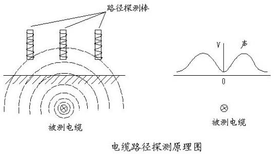 ? 電纜故障探測儀尋測電纜路徑原理為:給被測試電纜加一電磁波信號,通過(guò)定點(diǎn)儀磁信號接收通道接收路徑信號尋測電纜路徑。根據電纜正上方地面接收電磁信號最小的特點(diǎn),可以準確地找到電纜埋設位置。路徑探測原理如圖所示: