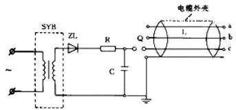 ? 所謂測聲法就是根據故障電纜放電的聲音進(jìn)行查找,該方法對于高壓電纜芯線(xiàn)對絕緣層閃絡(luò )放電較為有效。此方法所用設備為直流耐壓試驗機。電路接線(xiàn)如圖1所示,其中SYB為高壓試驗變壓器,C為高壓電容器,ZL為高壓整流硅堆,R為限流電阻,Q為放電球間隙,L為電纜芯線(xiàn)。當電容器C充電到一定電壓值時(shí),球間隙對電纜故障芯線(xiàn)放電,在故障處電纜芯線(xiàn)對絕緣層放電產(chǎn)生“滋、滋”的火花放電聲,對于明敷設電纜憑聽(tīng)覺(jué)可直接查找,若為地埋電纜,則首先要確定并標明電纜走向,再在雜噪聲音最小的時(shí)候,借助耳聾助聽(tīng)器或醫用聽(tīng)診器等音頻放大設備進(jìn)行查找。查找時(shí),將拾音器貼近地面,沿電纜走向慢慢移動(dòng),當聽(tīng)到“滋、滋 ”放電聲最大時(shí),該處即為故障點(diǎn)。使用該方法一定要注意安全,在試驗設備端和電纜末端應設專(zhuān)人監視。