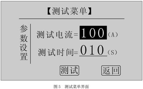 ? 在主界面中選中“開(kāi)始測試”項,點(diǎn)擊鼠標,儀器進(jìn)入測試菜單界面,如圖5 所示。默認測試電流為 100A,測試時(shí)間為 10s。