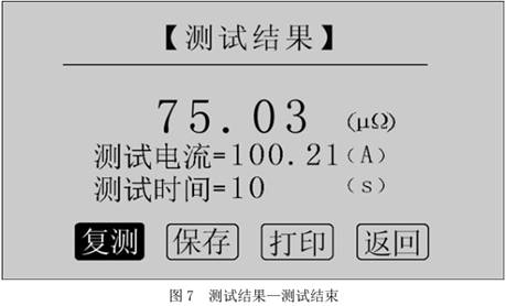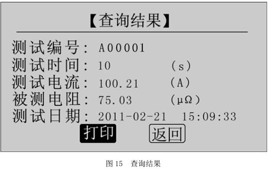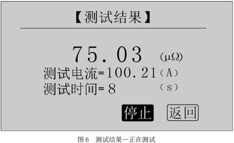 ? 在“測試菜單”中點(diǎn)擊“測試”項進(jìn)入“測試結果”界面,如圖 6 所示。界面上依次顯示電阻值、測試電流值和測試時(shí)間。