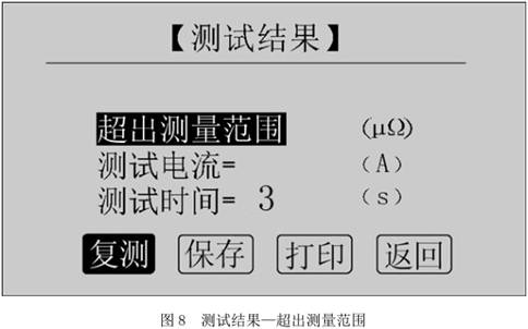 ? 若測量值超出測量范圍,液晶屏顯示“超出測量范圍”,如圖 8 所示,同時(shí)蜂鳴器報警。此時(shí)電流仍在輸出,直到計時(shí)結束。