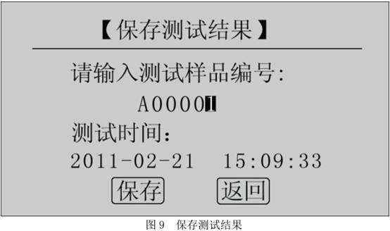 ? 使用鼠標輸入樣品編號,點(diǎn)擊“保存”項,測試結果將被保存到 I2 C 存儲器中,保存界面如圖 10 所示;點(diǎn)擊“返回”項,系統返回上一界面。
